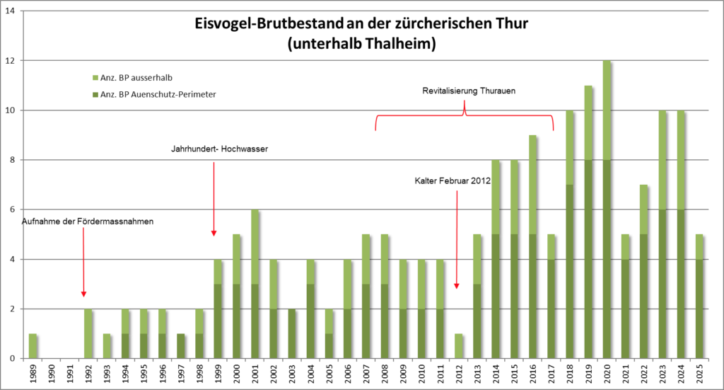 Die Brutsaison 2025 startete mit einem niedrigen Ausgangsbestand. Gründe dafür waren der spärliche Bruterfolg im Vorjahr infolge des aussergewöhnlichen Juni-Hochwassers, welches praktisch zum Totalverlust führte, sowie der weitere schwierige Witterungsverlauf mit häufigen Starkregenereignissen. Zwar war der Winter 2024/25 eher mild, doch dürften die vielen Wassertrübungen in den Regenperioden trotzdem zu einer erhöhten Sterblichkeit geführt haben. Im nicht begradigten Flussabschnitt unterhalb von Thalheim siedelten sich im Jahr 2025 nur 5 Brutpaare an, also halb so viele wie im Vorjahr. Der Abschnitt Thalheim/Altikon mit seinem renaturierten Flussmäander blieb im Jahr 2025 vermutlich ganz verwaist.